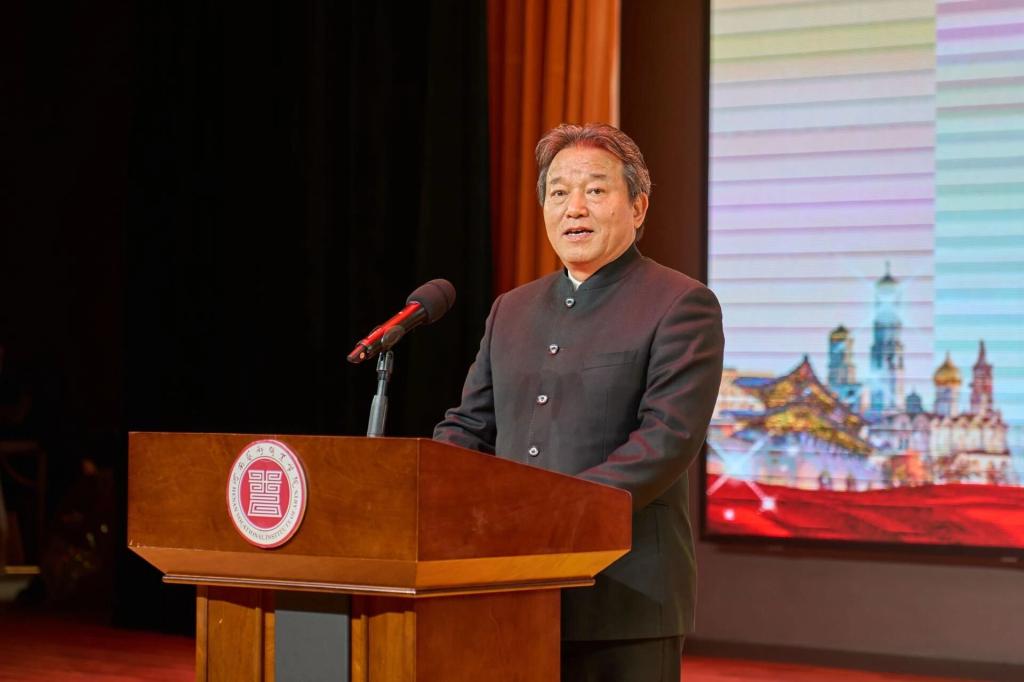 河南艺术职业学院校长周宝全在开幕式上致辞,代表学校全体师生,向莅临活动的领导、嘉宾,特别是远道而来的白俄罗斯、韩国等合作院校的友人,表示热烈欢迎和衷心感谢。他在致辞中强调,中外文化艺术交流是服务国家开放大局、增进国际理解与友谊的重要载体,也是学校培养具有国际视野艺术人才、展现真实立体河南的重要窗口。他指出,本届交流月是学校持续推进中外合作办学、深化“一带一路”艺术教育合作的重要平台。他引用俄罗斯谚语“独自行走快,结伴同行远”,寄望师生在本届交流月中不仅成为世界艺术的学习者,更要成为河南故事、中国故事的讲述者和传播者。